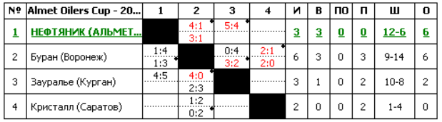 ![]() Almet Oilers Cup - 2025 Традиционный предсезонный турнир Almet Oilers Cup посвященный Дню работника нефтяной и газовой промышленности проходит в Альметьевске, на льду дворца спорта «Юбилейный». ________________________________________ ________________________________________ Регламент турнира: - Участвует 4 команды, "Нефтяник" Альметьевск - в качестве обязательного участника (хозяин турнира); - Турнир будет проходить по круговой системе - все команды сыграют по два матча друг с другом (дома - на выезде); - По итогам всех сыгранных матчей и набранных в них очков, определяется победитель и призёры; - Все матчи турнира проходят по правилам регламента ВКХЛ. ________________________________________ ________________________________________ Участники: 1. SALAMANNDER - Нефтяник (Альметьевск) 2. Zhukovao - Зауралье (Курган) 3. Duteser - Кристалл (Саратов) 4. Ax1le - Буран (Воронеж) ________________________________________ ________________________________________ Турнирная таблица: ![]() ________________________________________ ________________________________________ История турнира: Almet Oilers Cup 2023 г.: ХК Тамбов - VectorAlmet Oilers Cup 2025 г.: ??? ________________________________________ ________________________________________ Форма заявки на турнир: 1. Ник 2. Команда (За которую выступаешь в чемпионате ВХЛ)