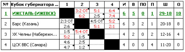 ![]() Кубок губернатора Самарской области - 2025 ________________________________________ ________________________________________ Регламент турнира: - Участвует 4 команды, ЦСК ВВС Самара - в качестве обязательного участника (хозяин турнира); - Турнир будет проходить по круговой системе - все команды сыграют по два матча друг с другом (дома - на выезде); - По итогам всех сыгранных матчей и набранных в них очков, определяется победитель и призёры; - Все матчи турнира проходят по правилам регламента ВКХЛ. ________________________________________ ________________________________________ Участники: 1. Region63 - ЦСК ВВС (Самара) 2. Barssiccc - Челны (Набережные Челны) 3. Pashok - Барс (Казань) 4. Emeral - Ижсталь (Ижевск) ________________________________________ ________________________________________ Турнирная таблица: ![]() ________________________________________ ________________________________________ История турнира: Кубок губернатора Самарской обл. 2025 г.: ??? ________________________________________ ________________________________________ Форма заявки на турнир: 1. Ник 2. Команда (За которую выступаешь в чемпионате ВХЛ)
